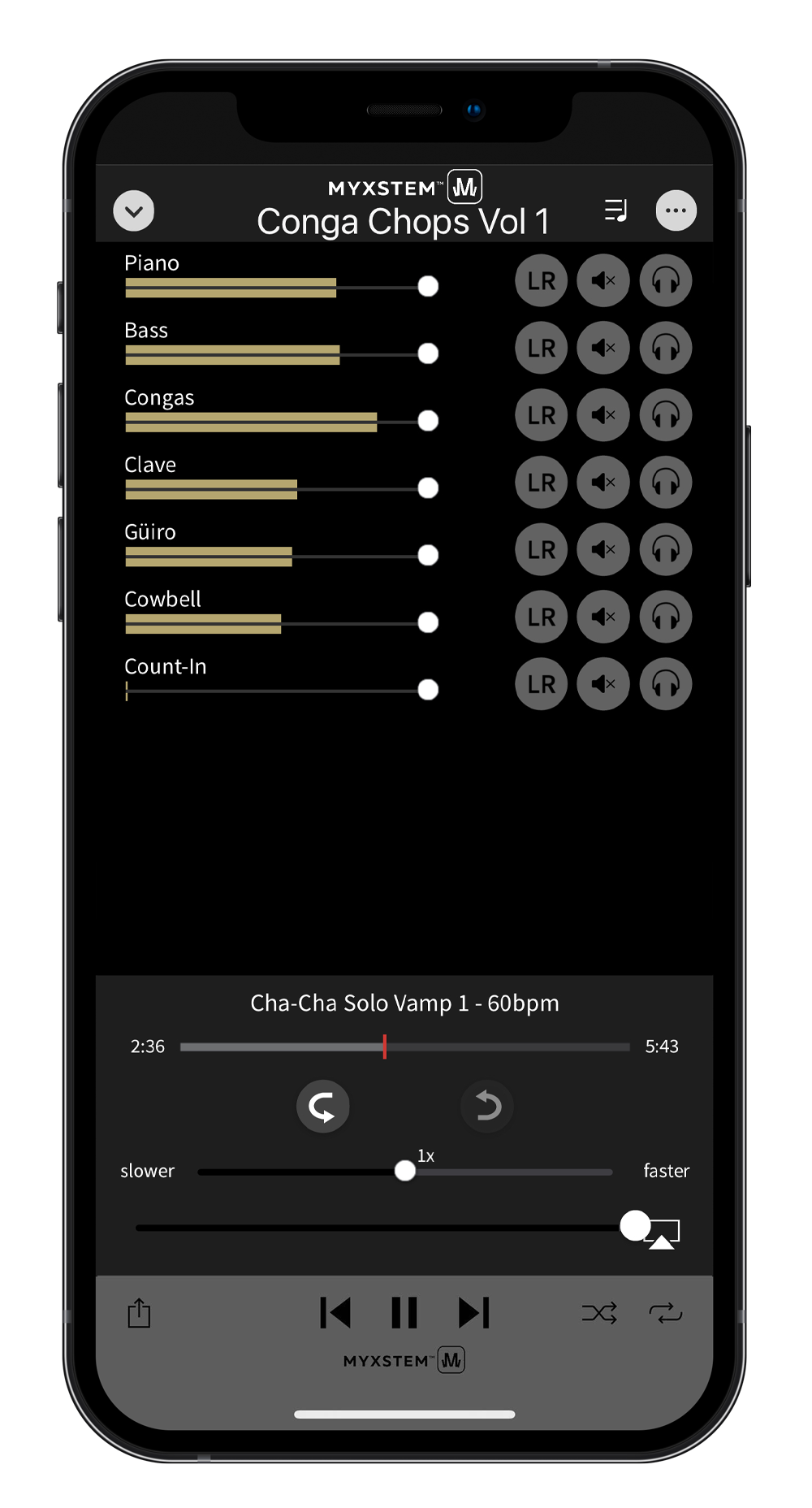 'Conga Chops Practice Loops - Vol 1' is a MYXSTEM app release, allowing users to completely control the listening experience.